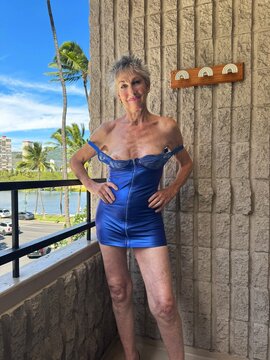I bought this outfit at Suzie's in Waikiki. I like the way the stockings and garters frame my pussy.